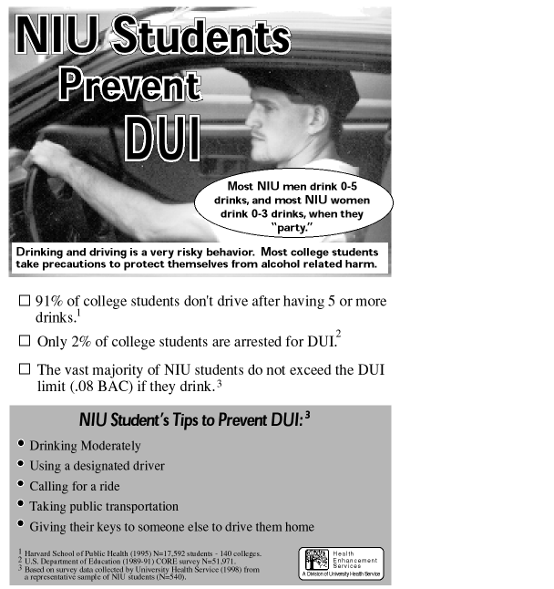 Northern Illinois University is a public, land grant institution with approximately 23,000 undergraduate and graduate students. In the 1989-90 academic year, Health Enhancement Services at NIU began using social marketing methods to inform students that, contrary to what they believed, the majority of their peers were in fact moderate and safe drinkers.The primary target audience for the alcohol intervention consisted of student drinkers (85% of the 23,000 NIU students).