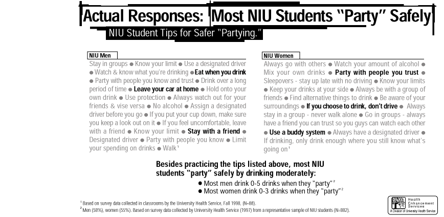 Of course, normative messages can be disseminated in other than poster format. Here are two examples of flyers developed and distributed in various locations at NIU in order to promote the positive, healthy norms of its students: